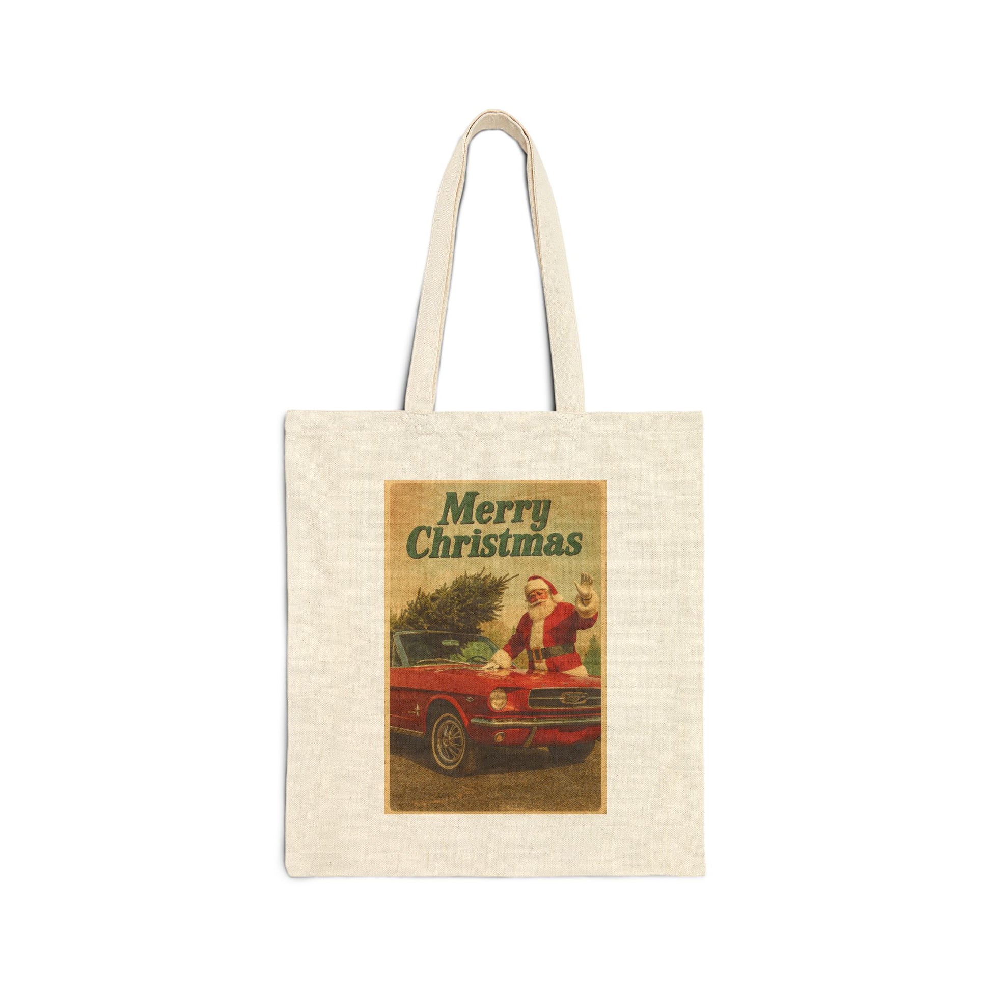 Vintage Santa with Red Ford Mustang Tote Bag | Merry Christmas Canvas Tote